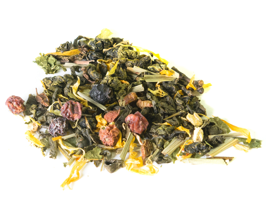 Смесь зелёного чая с имбирём / Лимонная трава / Цветки жасмина / Облепиха / Рябина / Боярышник / Лепестки смородины / Календула